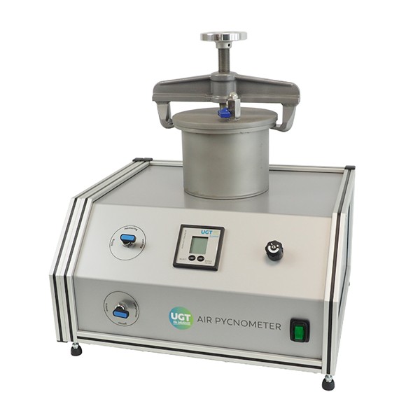 儀器由外置樣品室、與樣品室相聯通的內置壓力室及數字氣壓計等組成。測量前需要先對壓力室的體積和樣品室的體積(盛放土壤樣品的容器如取樣環等必須放入樣品室內)進行校準:先測量壓力室與樣品室聯通平衡前后的壓力變化,再將已知體積的校準塊(可用已知體積的砝碼等)放人樣品室重新測量壓力室與樣品室聯通平衡前后的壓力變化,即可完成對壓力室和樣品室體積的校準。土壤樣品經干燥稱重后(如此可以得出土壤含水量)放入樣品室,打開壓力室與樣品室聯通閥,測量氣體平衡前后的壓力變化。最終通過所附的Excell文檔,即可得出土壤空隙度、pF等于1.8時的土壤空隙或田間持水量、土壤飽和持水量等,而且可以根據下面公式得出土壤三相比: